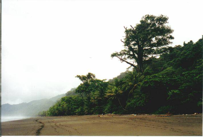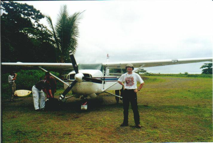 El vuelo en Cessna lleva cosa de una hora, tras el pesado de equipaje y pasajeros. Nos acompaña Felipe, un guía del parque que vuelve de unas vacaciones con una tabla de surf, deporte que se puede practicar debido al tamaño de las olas, lo que a su vez hace peligroso el baño, sobre todo en marea alta. Volamos a unos 7500 pies (San José está ya a unos 1200 m. de altura sobre el nivel del mar). El trayecto es impresionante. En su hora aproximada de duración, se vislumbran las grandes extensiones de bosque tropical, las montañas, las nubes que cubren casi continuamente grandes extensiones del país, el mar, los ríos que serpentean abundantes y que nunca son suficientes para desalojar tanta agua como cae a diario y la propia península de Ossa donde se encuentra el parque y que cuenta con frondosa vegetación salvo un gran claro en torno a una laguna. La pista de aterrizaje está paralela a la playa y es de gravilla y tierra. Un orero local se dedica a cortar las hierbas y hacerla transitable.
