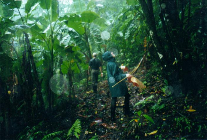 Cuando llegamos a un arroyo crecido, vemos a una pareja intentando atravesarlo por una parte donde había grandes guijarros. Eduardo les llama con un silbato y les hace volver atrás. Pasamos formando una cadena humana, agarrados de los antebrazos, por una zona donde el río es más ancho y la corriente es algo más débil. La técnica consiste en no intentar luchar contra la corriente, sino dejarse llevar un poco por ella. Ya ni me molesto en pensar en las botas y me meto con ellas. La tormenta arrecia y caen varios rayos en las cercanías, alguno a menos de 300m. Paz pregunta: ¿somo pararrayos andantes? Eduardo asiente resignado. Llegamos al campamento completamente empapados. Ya sabemos por qué se llama bosque lluvioso. Y eso que estamos en la temporada seca... Vemos peligrar el regreso del día siguiente.
